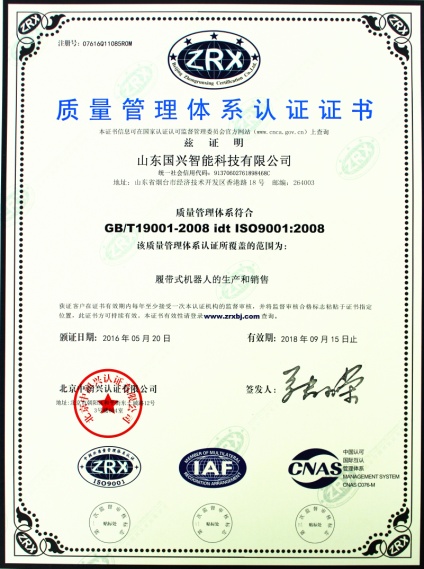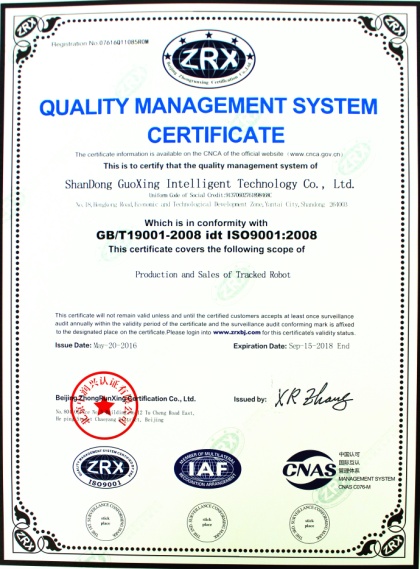 2016年5月國(guó)家正式頒發(fā)的質(zhì)量體系認(rèn)證書,“國(guó)興智能”履帶式機(jī)器人底盤的生產(chǎn)和銷售全面上市,目前研發(fā)產(chǎn)品有:SAFARA系列、SSR系列、SATV系列等