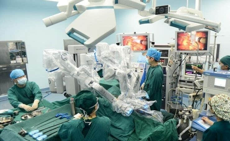 手術(shù)前工作準(zhǔn)備就緒,一臺近兩米高的設(shè)備揮舞著其“八爪魚”般的機械臂,像醫(yī)生一樣熟練地進行手術(shù):微創(chuàng)開刀、切除腫瘤到最后縫合。而在手術(shù)臺3米開外,一名醫(yī)生正在控制臺邊,通過操縱桿控制著機械臂的每一個步驟。