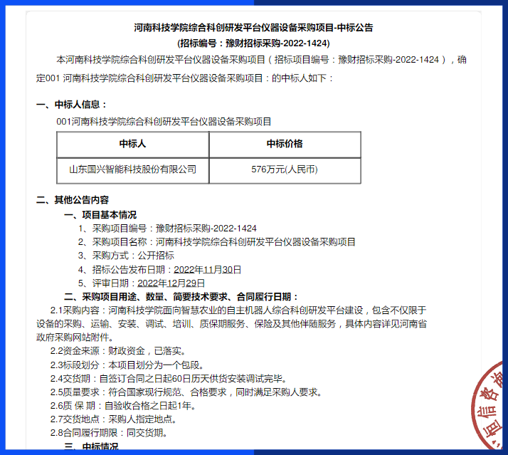 新年伊始,國興智能傳來喜訊,成功中標(biāo)河南科技學(xué)院綜合科創(chuàng)研發(fā)平臺儀器設(shè)備采購項目,中標(biāo)金額為576萬元。
